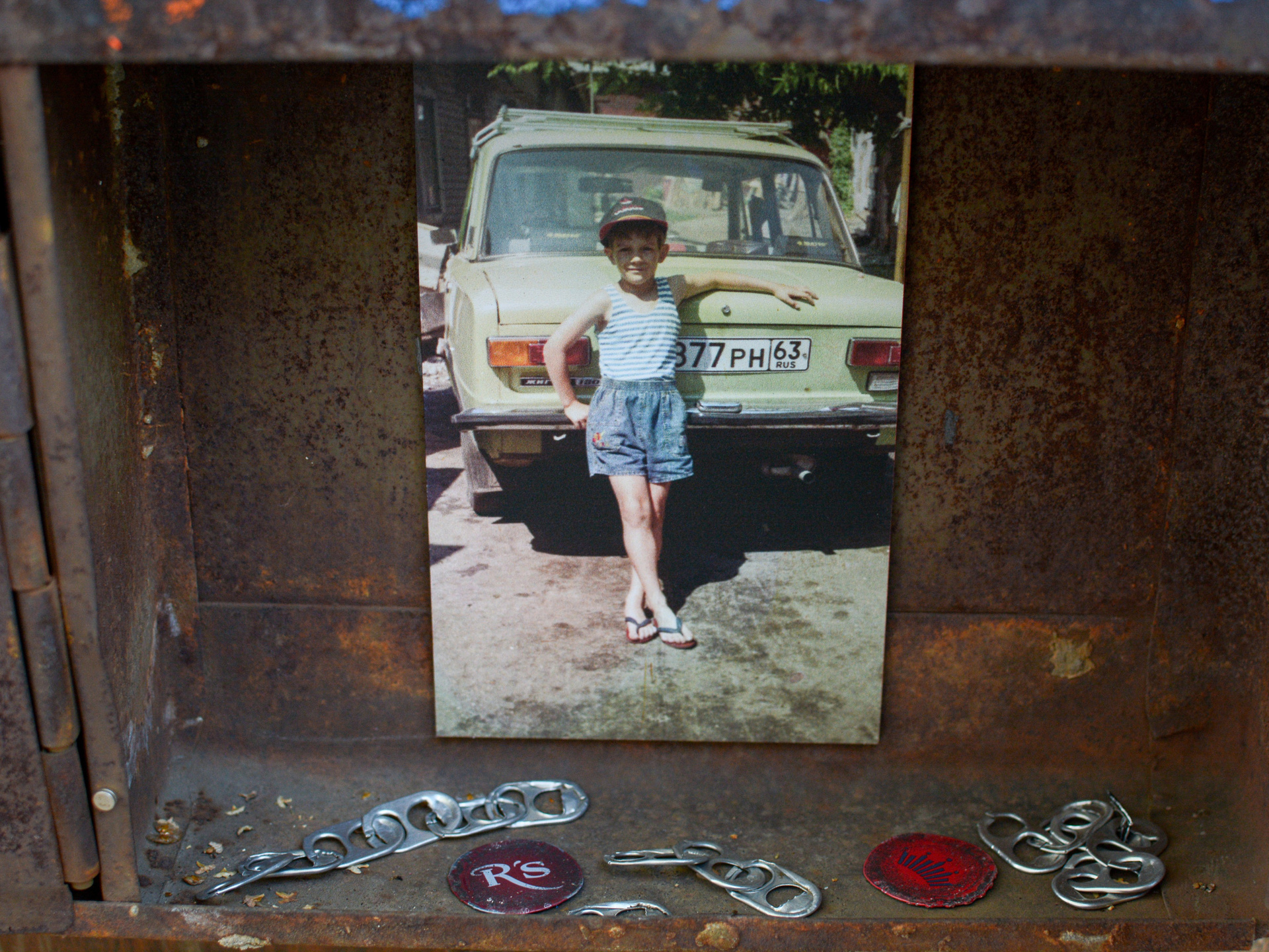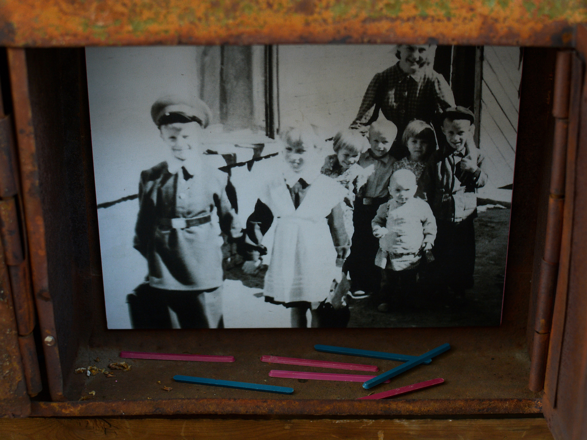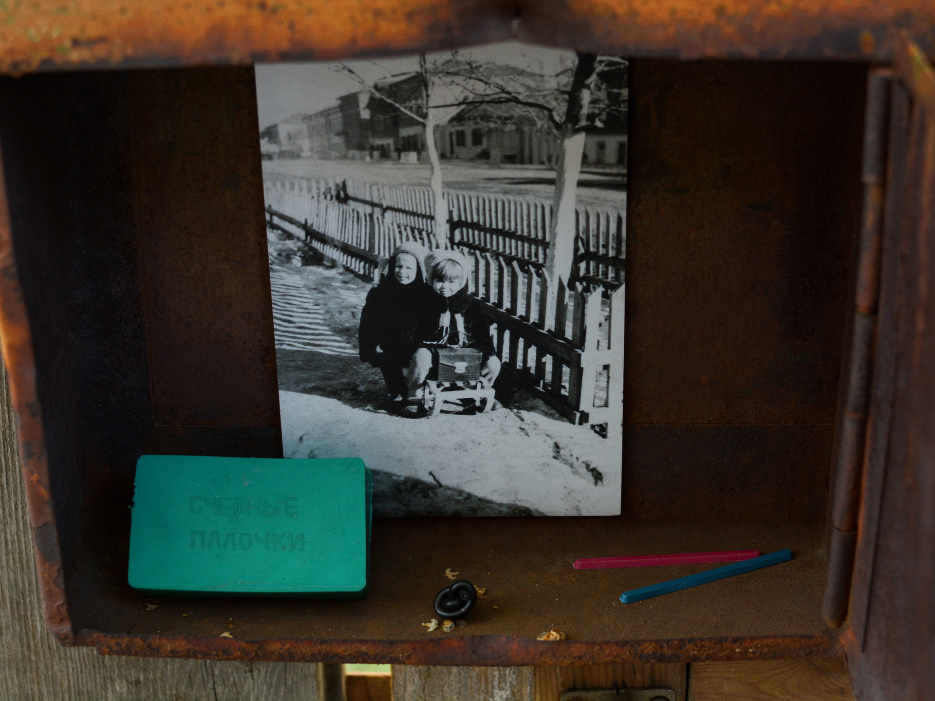 В почтовых ящиках лежат детские фотографии сегодняшних взрослых, росших в этом районе в 1960-х и 1990-х гг, а также артефакты тех времен. Снаружи представлен абстрактный антураж двора в супрематической манере.