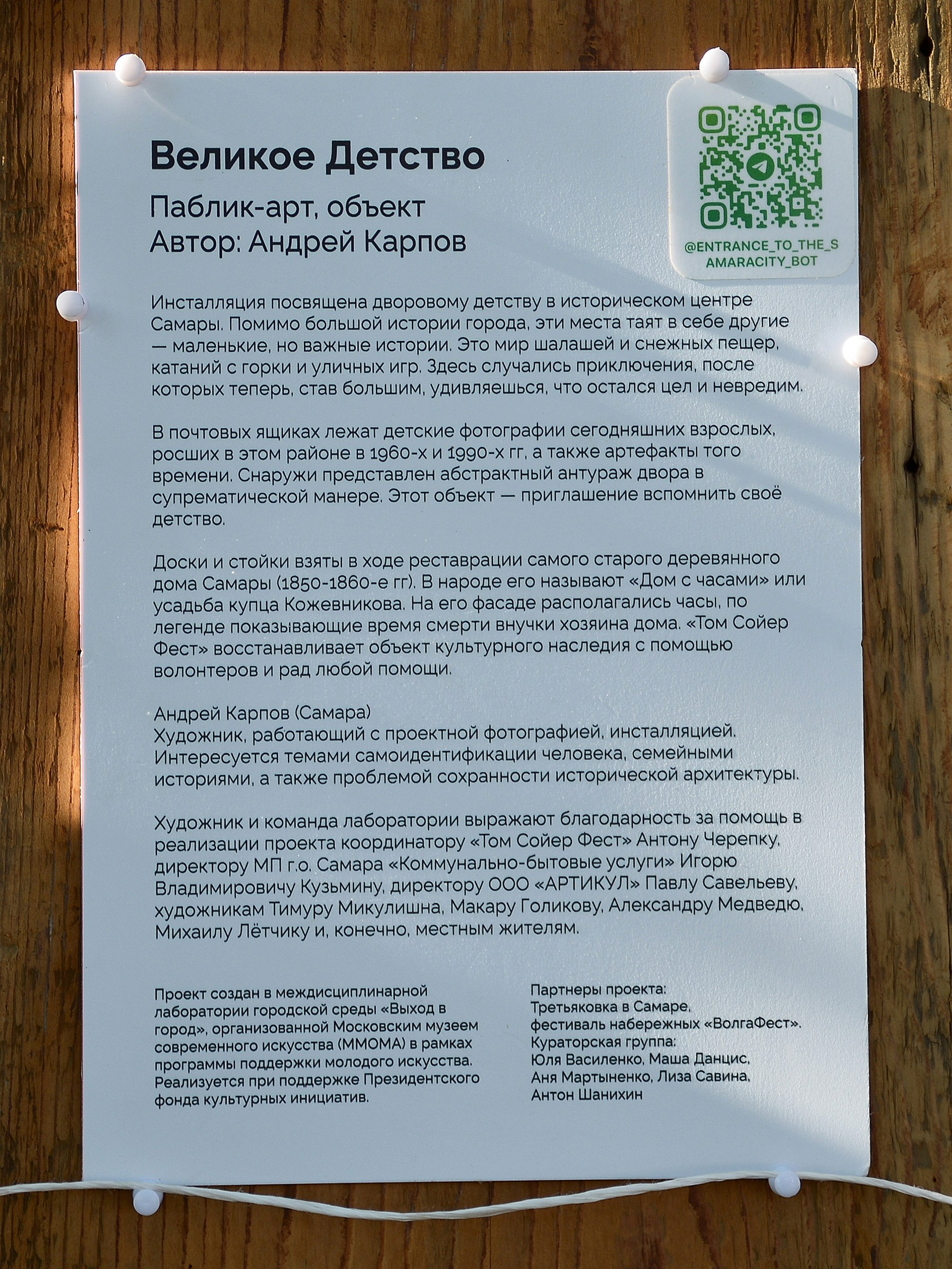 Инсталляция посвящена дворовому детству вокруг Бани № 1 в историческом центре Самары. Помимо большой истории города, эти места таят в себе другие — маленькие, но важные истории. Это мир шалашей и снежных пещер, катаний с горки и уличных игр. Здесь случались приключения, после которых люди, став большими спустя годы, удивляются, что остались целыми и невредимыми.